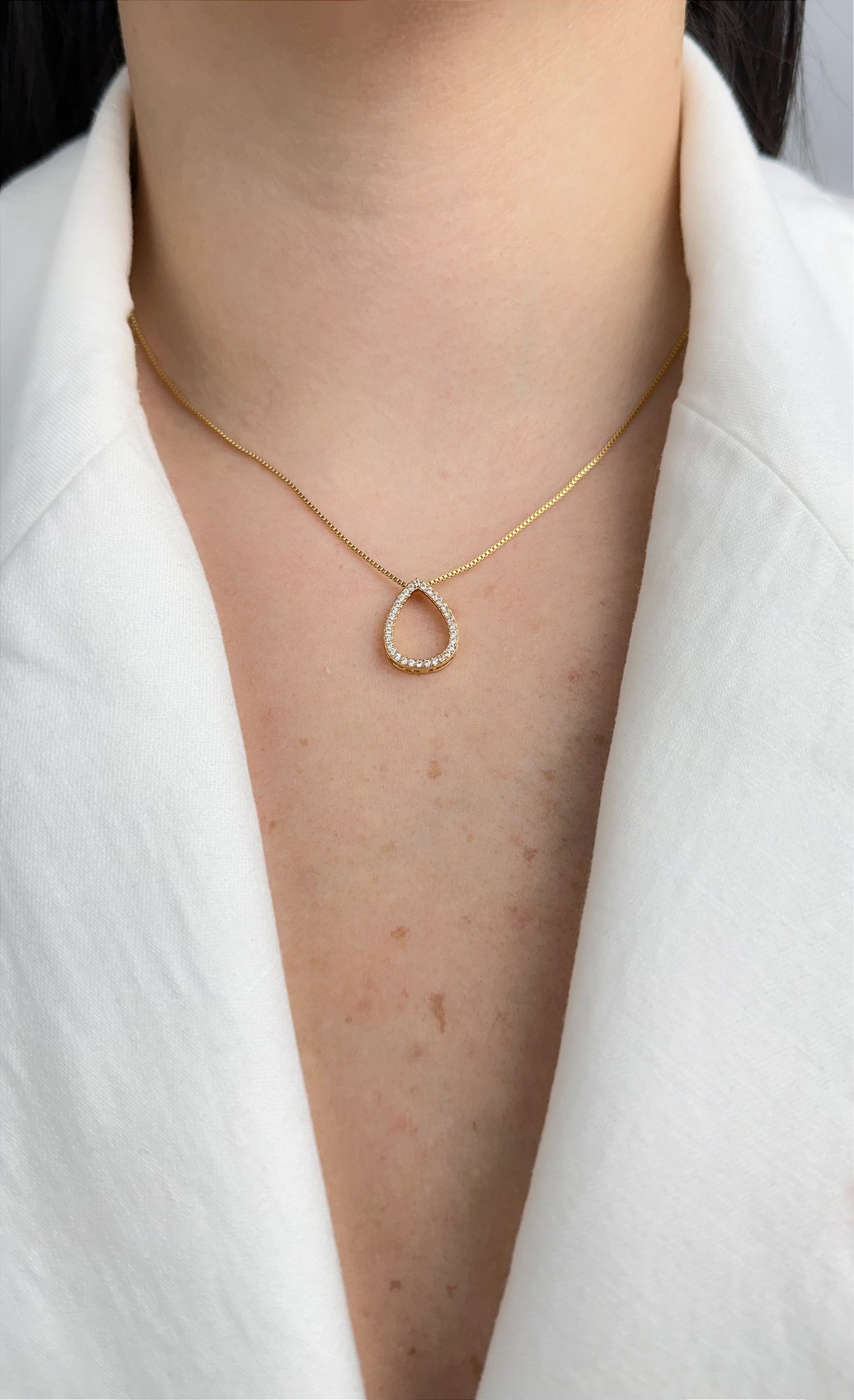 O Colar com Pingente de Gota Vazado Cravejado no Ouro CO705-O é uma joia que expressa sofisticação e delicadeza em perfeita harmonia. Seu pingente em formato de gota vazada, adornado com zircônias cravejadas, reflete a luz com brilho sutil e elegante.